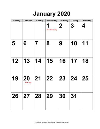 Here is a preview of the "2020 Large-Number Calendar with Holidays" calendar: