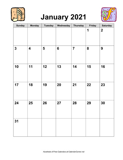 Calendar Description: 2021 calendar in portrait orientation. This calendar is blank; it does not include holidays. This calendar contains all 12 months, January through December. The calendar includes graphics for each month. The graphics follow a musical theme.