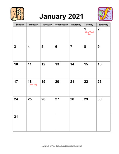 Calendar Description: 2021 calendar in portrait orientation. Includes major holidays shown in red. This calendar contains all 12 months, January through December. The calendar includes graphics for each month. The graphics follow a musical theme.