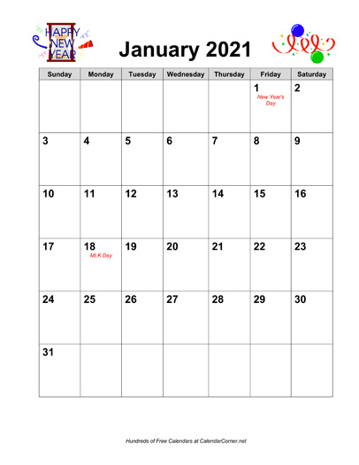 Calendar Description: 2021 calendar in portrait orientation. Includes major holidays shown in red. This calendar contains all 12 months, January through December. The calendar includes graphics themed for each month.