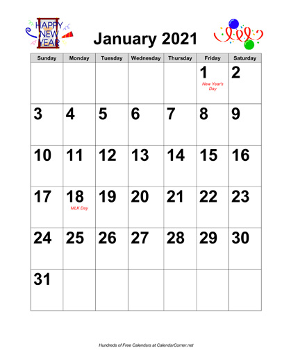 Calendar Description: 2021 calendar in portrait orientation. Includes major holidays shown in red. The digits for the dates are in large type. This calendar contains all 12 months, January through December. The calendar includes graphics themed for each month.