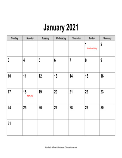 Calendar Description: 2021 calendar in landscape orientation. Includes major holidays shown in red. This calendar contains all 12 months, January through December.
