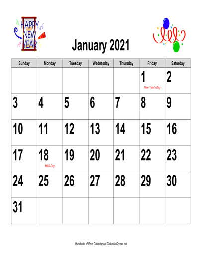 Calendar Description: 2021 calendar in landscape orientation. Includes major holidays shown in red. The digits for the dates are in large type. This calendar contains all 12 months, January through December. The calendar includes graphics themed for each month.