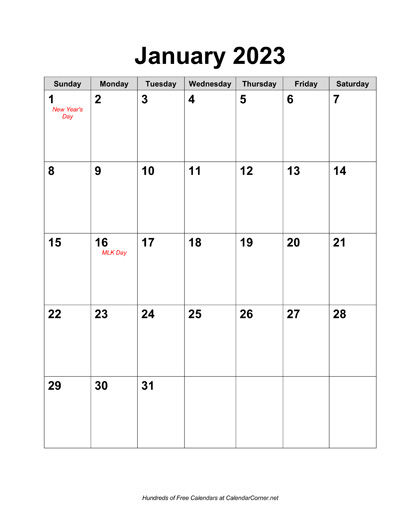 Calendar Description: 2023 calendar in portrait orientation. Includes major holidays shown in red. This calendar contains all 12 months, January through December.