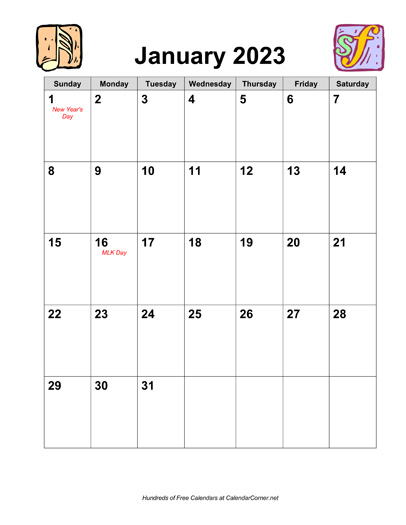 Calendar Description: 2023 calendar in portrait orientation. Includes major holidays shown in red. This calendar contains all 12 months, January through December. The calendar includes graphics for each month. The graphics follow a musical theme.