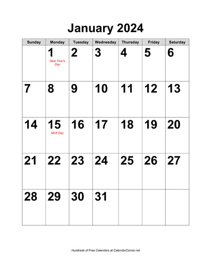 Here is a preview of the "2024 Large-Number Calendar with Holidays" calendar: