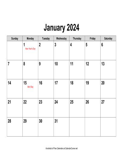Calendar Description: 2024 calendar in landscape orientation. Includes major holidays shown in red. This calendar contains all 12 months, January through December.