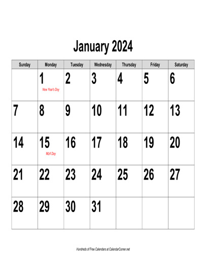 Here is a preview of the "2024 Large-Number Calendar, Landscape with Holidays" calendar: