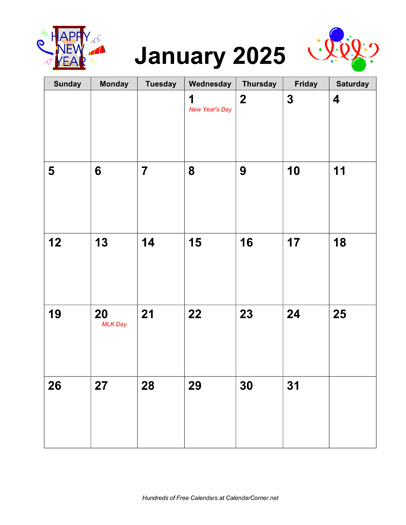 Calendar Description: 2025 calendar in portrait orientation. Includes major holidays shown in red. This calendar contains all 12 months, January through December. The calendar includes graphics themed for each month.