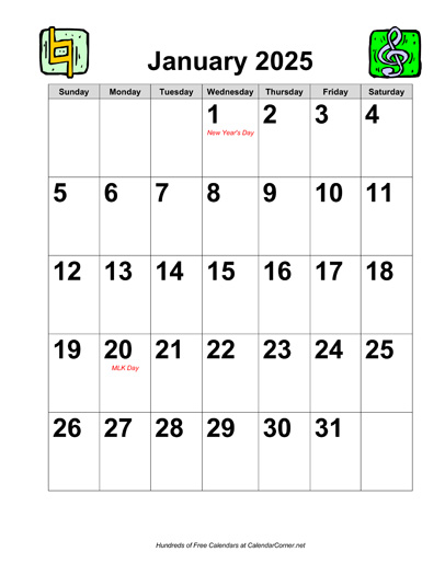 Here is a preview of the "2025 Large-Number Music Calendar with Holidays" calendar: