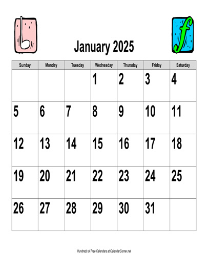 Calendar Description: 2025 calendar in landscape orientation. This calendar is blank; it does not include holidays. The digits for the dates are in large type. This calendar contains all 12 months, January through December. The calendar includes graphics for each month. The graphics follow a musical theme.