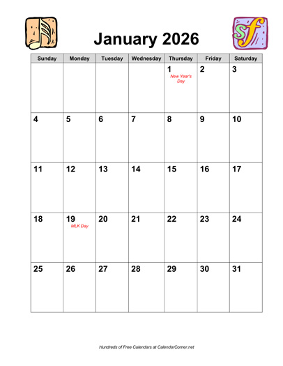 Calendar Description: 2026 calendar in portrait orientation. Includes major holidays shown in red. This calendar contains all 12 months, January through December. The calendar includes graphics for each month. The graphics follow a musical theme.