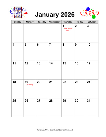 Calendar Description: 2026 calendar in portrait orientation. Includes major holidays shown in red. This calendar contains all 12 months, January through December. The calendar includes graphics themed for each month.