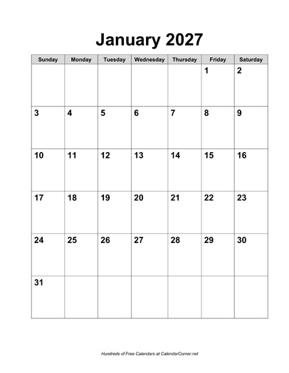 Calendar Description: 2027 calendar in portrait orientation. This calendar is blank; it does not include holidays. This calendar contains all 12 months, January through December.
