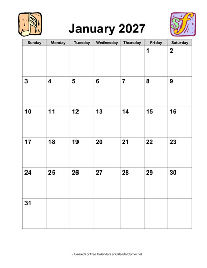 Calendar Description: 2027 calendar in portrait orientation. This calendar is blank; it does not include holidays. This calendar contains all 12 months, January through December. The calendar includes graphics for each month. The graphics follow a musical theme.
