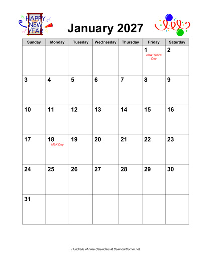 Calendar Description: 2027 calendar in portrait orientation. Includes major holidays shown in red. This calendar contains all 12 months, January through December. The calendar includes graphics themed for each month.