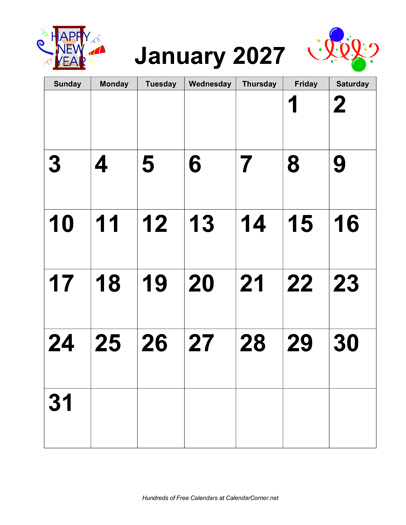 Calendar Description: 2027 calendar in portrait orientation. This calendar is blank; it does not include holidays. The digits for the dates are in large type. This calendar contains all 12 months, January through December. The calendar includes graphics themed for each month.