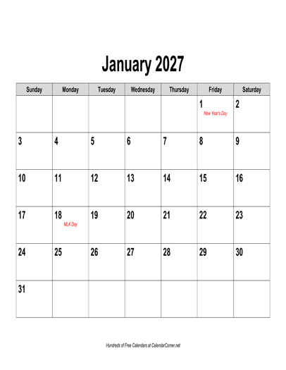 Calendar Description: 2027 calendar in landscape orientation. Includes major holidays shown in red. This calendar contains all 12 months, January through December.