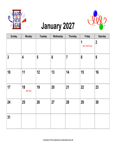 Calendar Description: 2027 calendar in landscape orientation. Includes major holidays shown in red. This calendar contains all 12 months, January through December. The calendar includes graphics themed for each month.