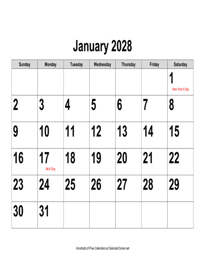 Here is a preview of the "2028 Large-Number Calendar, Landscape with Holidays" calendar: